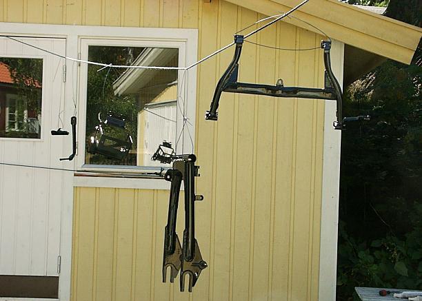 Sand blasted and cleaned frame hanging between ladder and a corner of the house, ready for painting.